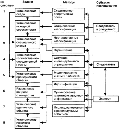 Рис. 4. Структура поисково-идентификационной деятельности взлома, при изучении следов транспорта – модель автомашины, при изучении крови –.группа и тип крови и т.д. Наряду со стационарными классификациями для сужения исходной совокупности могут использоваться хорошо выраженные и устойчивые особенности искомого объекта, например автомашины марки МАЗ-205 с сильно изношенными протекторами задних колес, пистолеты «ТТ» с дефектом (выщербленностью) бойка и т.п. В отличие от стационарных такие классы называются «нестационарными» или «специальными». Переход от широких ко все более узким группам объектов осуществляется путем последовательного накопления идентификационных признаков. Чем больше идентификационных (индивидуализирующих) признаков установлено в процессе сравнительного исследования, тем более узкую группу они характеризуют. При определении классификационной принадлежности объектов необходимо учитывать не только количество, но и специфичность установленных признаков. Определение исходной совокупности как классификационное исследование характеризуется следующими чертами: а) объектом исследования является след искомого объекта (в широком смысле слова). Механизм образования следа изучается как элемент расследуемого события. Так, механизм образования следа на преграде сопоставляется с данными о способе взлома и используемыми в этих случаях преступниками орудиями взлома; б) образцы в виде конкретных проверяемых объектов отсутствуют, Для сравнения в этих случаях могут быть привлечены так называемые «научные образцы» – эталоны различных классификационных групп, например образцы металлов, тканей, порохов, пищевых продуктов, биологических видов и т.д.; в) сравнение следа искомого объекта с эталоном производится по классификационным признакам стандартных классификаций; г) установление исходной совокупности происходит, как правило, в несколько этапов в направлении максимального сужения группы. Определение наиболее узкой классификационной группы требует специального научно-технического исследования и привлечения специалистов. Следователь, как правило, может установить лишь принадлежность искомого объекта к относительно широким классификационным группам (например, след оставлен грузовым автомобилем, но не автомобилем определенной марки, пуля стреляна из пистолета калибра 9 мм, но не конкретной модели и т.д.). Из сказанного ясно, что определение исходной совокупности не может быть отнесено к компетенции следователя или суда. В практике расследования часто встречаются классификационные исследования, не связанные с идентификацией и имеющие самостоятельное доказательственное значение. Таково, например, исследование химической природы вещества, найденного на месте предполагаемого отравления (мышьяк, морфий, барбитураты и т.д.), разрешение вопроса о принадлежности обнаруженного при личном обыске задержанного предмета к огнестрельному или холодному оружию, случаи определения природы, назначения и наименования предметов. Классификация отнесение предмета к определенному роду, виду, сорту и т.п., в этих случаях не преследует цели индивидуализации, выделения единичного объекта из их определенной массы. В отличие от идентификации такие исследования называются определением родовой (видовой) принадлеж