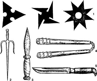 Рис. 23. Холодное оружие: 1 – сурикен (сякеи, сюрикен), 2 – сай, 3 – кинжал метательный (Мнпнйя) (метательное холодное оружие), 4 – нунчаку (холодное оружие ударно дробящего действия), 5 – финский нож (колюще-режущее холодное оружие) В соответствии с законом запрещается оборот в качестве гражданского оружия: 1) кистеней, кастетов, сурикенов, бумерангов и других специально приспособленных для использования в качестве оружия предметов ударно-дробящего и метательного действия, за исключением спортивных снарядов; 2) холодного клинкового оружия и ножей, клинки и лезвия которых имеют длину более 90 мм, либо автоматически извлекаются из рукоятки при нажатии на кнопку или рычаг и фиксируются ими, либо выдвигаются за счет силы тяжести или ускоренного движения и автоматически фиксируются. К холодному оружию не относятся различные предметы производственного и хозяйственно-бытового назначения, хотя они по своим конструктивным особенностям могут обладать высокими поражающими свойствами и использоваться в качестве оружия при совершении преступлений: инструменты, ножи – кухонные, карманные, боцманские, стропорезные, водолазные, сапожные, туристские, сувенирные и т.п., медицинские ножи и скальпели, никоторые виды охотничьих ножей, предназначенных для выполнения только вспомогательных операций (разделочные, для обдирания шкур и т.п.). При решении вопросов об отнесении конкретного предмета к холодному оружию не всегда необходимо проведение экспертных исследований. Так, легко узнаваемо, а потому не нуждается в исследовании с этой целью боевое и спортивное оружие, которое имеет общеизвестные формы, специальные маркировочные обозначения (сабли, шашки, рапиры, стилеты, кортики и т.п.). Также обычно без затруднений могут быть отнесены к холодному оружию кастеты, кистени, нунчаку и другие предметы ударно-дробящего действия, использование которых в качестве гражданского оружия законом запрещено (за исключением спортивных снарядов). Иное положение складывается при исследовании такого криминального холодного оружия, как финские ножи, кинжалы. Ножи, кинжалы, используемые в преступных целях, чаще всего изготавливаются самодельным, реже кустарным способом, имеют порой значительные отступления от принятых стандартов либо содержат признаки разных типов оружия. При проведении исследования подобных объектов эксперты опираются на общепризнанные эталоны, стандартные образцы холодного оружия, специальные таблицы, справочные альбомы с описаниями, рисунками, чертежами и фотоснимками такого оружия. Одновременно в каждом случае учитываются общая форма оружия, размеры, прочность и специальная заточка его клинка, форма и удобство удержания в руке рукоятки, наличие или отсутствие упора, отграничивающего рукоятку от клинка, и другие признаки. При криминалистическом исследовании холодного метательного оружия необходимо установить возможность поражения цели данным предметом на расстоянии. Если метательное оружие, предназначенное для поражения цели снарядом при помощи механического устройства (лук, арбалет), изготовлено заводским способом, то вопрос об его относимости к холодному оружию может быть решен при осмотре. В отношении кустарно изготовленного оружия данный вопрос обычно решается в процессе экспертного исследования. К холодному метательно