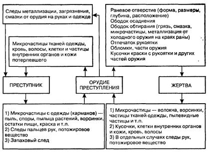 Рис. 24. Образование взаимных следов на преступнике и потерпевшем при использовании холодного оружия Орудие преступления несет на себе самые разнообразные следы, помогающие установлению линии связи и по отношению к лицу, совершившему преступление, и по отношению к жертве (рис. 24). В каждом случае могут быть обнаружены взаимные следы, которые дополняют друг друга, связывают различные объекты между собой, свидетельствуя о пребывании конкретных лиц в определенное время на определенном месте. Так, при установлении факта применения данного орудия конкретным лицом важное значение приобретает обнаружение на исследуемом орудии следов пальцев рук, потожирового вещества, микрочастиц с одежды (карманов) подозреваемого, а на руках подозреваемого и его одежде следов металлизации, загрязнений, смазки от этого самого орудия. Линия связи от орудия преступления к жертве, т.е. разрешение вопроса о нанесении удара, например, данным конкретным ножом, устанавливается при соответствии раневого отверстия, его размеров (глубины, ширины) и формы данному орудию. Определенное значение имеет ободок (поясок) обтирания (грязь, микрочастицы, следы металлизации, смазки), отпечаток рукоятки (ее упора, ограничителя), обломки, части орудия, кусочки краски от рукоятки и т.п. как в раневом отверстии и вокруг него, так и на одежде потерпевшего. Эти данные обычно являются исходными для идентификации по имеющимся на самом ноже следам наложений (волокон, ворсинок, пылевидных частиц с одежды, а также крови, волос, кусочков и клеток внутренних органов и кожи потерпевшего). Кроме того, на ноже могут быть следы пальцев рук, потожирового вещества потерпевшего, если он касался ножа, хватал его при попытке вырвать из рук преступника. Связь «преступник – потерпевший» может быть выявлена и непосредственно при обнаружении на руках подозреваемого, его одежде (в карманах) дополнительных (вторичных) следов, образовавшихся в результате обратного отражения. Так, на преступнике (на его руках, одежде, в карманах и т.п.) могут быть обнаружены микрочастицы с одежды, кровь, клетки, кусочки и частицы внутренних органов, кожи потерпевшего, перенесенные с орудия, которым было совершено преступление.