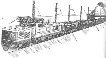Первоначально электрическая тяга применялась на городских трамвайных линиях и промышленных предприятиях, особенно на рудниках (рис. 10.16) и в угольных шахтах, поскольку развивает гораздо большее тяговое усилие по сравнению с паровозной и тепловозной тягой (что необходимо для больших уклонов), а также обеспечивает экологически чистые и комфортные условия эксплуатации локомотивов. Техника электрических железных дорог за время их существования изменилась коренным образом, сохранился только принцип действия. Применяется привод осей локомотива от электрических тяговых двигателей, которые используют энергию электростанций. Эта энергия подводится от электростанций к железной дороге по высоковольтным линиям электропередачи, а к электроподвижному составу – по контактной сети. Обратной цепью служат рельсы и земля. Применяются три различные системы электрической тяги – постоянного тока, переменного тока пониженной частоты и переменного тока стандартной промышленной частоты 50 Гц. В первой половине ХХ столетия до второй мировой войны применялись две первые системы, третья получила признание в 50-х годах. На современных электровозах широко применяют автоматизацию управления и оптимизацию режимов с помощью микропроцессорной техники. Внедряется бортовое и стационарное диагностирование оборудования. Совершенствуется аппаратура защиты от токов короткого замыкания и перенапряжений. Для увеличения силы тяги все электровозы, как правило, оборудуют системой, позволяющей соединять два или три локомотива и управлять этим сцепом из одной кабины. Применяют также устройство, обеспечивающее ведение (управляя по радио из передней кабины головного электровоза) состава из двух и более сцепленных друг с другом поездов. В горнодобывающей промышленности развитие механизированной откатки было связано с появлением в США в 1881 г. тягачей-воздуховозов, работавших сжатым воздухом. Широкое распространение воздуховозы получили в Германии, Чехии и Словакии, где до настоящего времени используются воздуховозы мощностью 70 л. с. и радиусом действия до 10 км. Для достижения максимальной взрывобезопасности на угольных шахтах наряду с воздуховозами с 1967 года стали использоваться гидровозы – локомотивы, у которых в качестве аккумулятора энергии и двигателя используют вращающийся маховик. Маховик представляет собой массивный диск массой до 2 т, закрепленный на раме локомотива. Раскручивание маховика (зарядку) осуществляют на остановках сжатым воздухом от пневмосети, электроэнергией или гидротурбиной от силовых водоводов (на гидрошахтах). Зарядку маховика отечественных гидровозов осуществляют пневмодвигателем, установленным на корпусе маховика вместе с редуктором, а передачу крутящего момента колесным парам – при помощи коробки передач. В некоторых зарубежных конструкциях гидропривод представляет собой агрегат, состоящий из маховика и электрической машины, смонтированных на общем валу и заключенных в общий корпус. Во время зарядки электрическая машина работает как двигатель, а во время тягового режима в качестве генератора, питающего тяговые двигатели. Основными недостатками гидровозов являются малый пробег и отсутствие постоянной готовности к действию. В конце XIX и начале XX в. начинает распространяться электровозная откатка. В 1882 г.