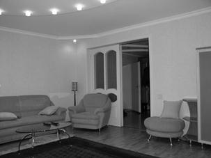It’s very comfortable and well planned. There are three rooms, a kitchen, a bathroom and a hall in our apartment. There is also a balcony and we enjoy a lovely view of the river. We use our living room as a dining room and as a sitting room, because it’s very large. In the middle of the room there is a big table and six tables around it. Opposite the window there is a wall unit with lots of books, a TV-set and a DVD player.