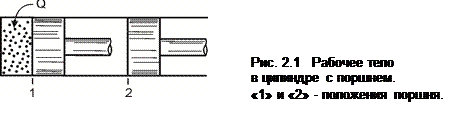 Закон сохранения и превращения энергии указывает, что энергия не исчезает и не возникает, она лишь переходит из одного вида в другой в строго эквивалентных количествах. Важно подчеркнуть, что закон сохранения и превращения энергии утверждает не сохранение энергии вообще, а ее сохранение при превращениях из одной формы в другую. Первый закон термодинамики представляет собой частный случай закона сохранения и превращения энергии в приложении к тепловым процессам в термодинамических системах. Из первого закона термодинамики следует, что если система (тело) является изолированной, т.е. она не обменивается энергией с окружающей средой, то ее внутренняя энергия не изменяется. Иначе говоря, внутренняя энергия изолированной системы постоянна. Изменение энергии системы (тела) возможно лишь при энергообмене с окружающей средой, т.е., при подводе (или отводе) к термодинамической системе теплоты или работы. Изменение энергии системы приводит к изменению ее состояния. Следовательно, каждому состоянию системы соответствует вполне определенная величина внутренней энергии. Таким образом, внутренняя энергия системы является однозначной функцией ее состояния. Рассмотрим подвод теплоты Q к рабочему телу, находящемуся в цилиндре с поршнем (рис. 2.1). Рабочее тело при расширении перемещает поршень из положения 1 в положение 2 и совершает работу L против внешних сил. Полный обмен энергией между рабочим телом и окружающей средой равен Q – L, а вся энергия равна изменению внутренней энергии рабочего тела: