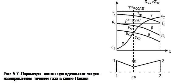 Сопло Лаваля применяется в том случае, когда необходимо получение сверхзвуковых скоростей истечения. Это может быть достигнуто, если располагаемая степень понижения давления превосходит критическую величину. Поэтому, далее мы будем рассматривать процесс истечения из сопла Лаваля при условии π с.р. > π кр. 5.4.1 Изменение параметров потока вдоль сопла Лаваля. При идеальном энергоизолированном течении газа параметры потока изменяются по длине сопла Лаваля так, как показано на рис. 5.7. В суживающейся части сопла поток разгоняется до скорости звука, которая достигается в критическом (минимальном) сечении сопла. Течение газа и изменение параметров потока до критического сечения сопла полностью аналогично течению в суживающемся сопле при π с.р. ≥ π кр. (рис. 5.4).
