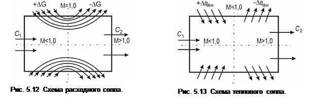 через стенки канала. Для получения сверхзвуковой скорости (М > 1) необходимо изменить знак воздействия на обратный, т.е. отводить газ из канала (dG < 0). Канал постоянного сечения, в котором увеличение скорости газа достигается за счет изменения расхода по его длине, называется расходным соплом. Схема расходного сопла приведена на рис. 5.12. Здесь в канале цилиндрической формы (dF = 0) газ подводится (или отводится) через перфорированные стенки канала. Физически характер расходного воздействия на течение в сопле объясняется тем, что подвод газа через стенки в дозвуковой части сопла как бы уменьшает эффективную площадь сечения потока (рис. 5.12), а отвод газа в сверхзвуковой части - увеличивает ее. Условная линия, разделяющая основной поток и часть газа, подводимую и отводимую через стенки расходного сопла, образует профиль сопла. Противоположное воздействие на поток, а, именно, подвод газа при сверхзвуковом течении и отвод при дозвуковом, в соответствии с (5.22) приводит к торможению потока (dс < 0). 5.5.2 Тепловое воздействие. Если dq вн. ≠ 0, а dF = dG = dl вн. = dlr = 0, то уравнение (5.21) можно записать так: