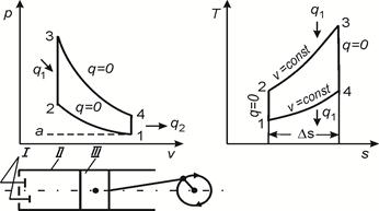 Поршневые двигатели широко используются в современной технике: на легких самолетах, автомобилях, тракторах, тепловозах и др. Рабочими элементами поршневого двигателя являются цилиндр ІІ с поршнем ІІІ (рис. 6.11), соединенным через кривошипно-шатунный механизм и коленчатый вал с потребителем работы (винтом, колесами, генератором и др.). В цилиндре имеются два отверстия с клапанами І для впуска рабочего тела (воздуха или топливовоздушной смеси) и выпуска продуктов сгорания в конце цикла. Наибольшее распространение получили два типа поршневых двигателей – с принудительным воспламенением топливовоздушной смеси (цикл Отто) и с воспламенением за счет сжатия воздуха (цикл Дизеля).