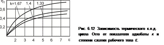 Формула (6.33) показывает, что термический к.п.д. цикла Отто зависит от степени сжатия (ε) и рода рабочего тела (k, R). Как следует с ростом ε и k термический к.п.д. цикла растет (рис. 6.12).