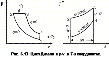 Следует отметить, что в реальных поршневых двигателях, работающих по циклу Отто, увеличение ε в целях улучшения экономичности двигателя ограничивается определенными пределами. При использовании в качестве топлива бензина увеличение ε > 9…12 вызывает детонационное сгорание топливовоздушной смеси, которое приводит к нарушению нормальной работы двигателя, перегреву его отдельных деталей и быстрому выходу из строя. 6.3.2 Цикл с подводом теплоты при постоянном давлении р = const (цикл Дизеля). Детонационного горения при высоких степенях сжатия можно избежать, если сжимать не горючую смесь, а чистый воздух. В этом случае топливо вводится в цилиндр после окончания процесса сжатия и самовоспламеняется под действием высокой температуры сжатого воздуха. Подвод топлива и его горение происходят при постоянном давлении в цилиндре. Этот способ реализуется в цикле Дизеля, изображенном в р - υ и Т - s координатах на рис. 6.13. Цикл состоит из двух адиабат (сжатия 1-2 и расширения 3-4), изобары 2-3 подвода теплоты q 1 и изохоры 4-1, отвода теплоты q 2. В идеальном цикле Дизеля также не рассматриваются вспомогательные процессы всасывания и выхлопа. Основными параметрами цикла являются степень сжатия ε и степень расширения ρ в процессе подвода тепла. Получим формулы для q 1 и q 2: