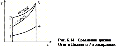 Формула (6.41) показывает, что к.п.д. цикла Дизеля зависит от физической природы газа (k, R) и степени сжатия (ρ) в процессе подвода теплоты. При постоянном значении ρ величина ηt растет c ростом ε. 6.3.3 Сравнение циклов Отто и Дизеля. Сравнение выполнено в предположении, что в обоих циклах одинаковы параметры рабочего тела в исходной точке р 1, Т 1 и максимальные значения давления и температуры р 3, Т 3. Совместив эти циклы в Т - s координатах (рис. 6.14), сравним величины их термических к.п.д., базируясь на формуле (3.3). Видно, что при принятых условиях сравнения, к.п.д. цикла Дизеля выше, чем к.п.д. цикла Отто, т. к. при равных количествах отведенной теплоты (q 2Д = q 2О) количество подведенной теплоты в цикле Дизеля больше (q 1Д > q 1О). Более высокая
