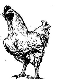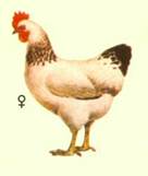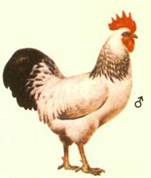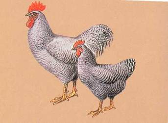 Рис. 6. Порода суссекс Масса взрослых кур — 2,5-2,7 кг, петухов — 3,2-3,5 кг. Яйценоскость — 175-200 яиц, масса яйца — 58 г. Скорлупа коричневая. Мясные линии кур суссекс используют в скрещиваниях с сочетающимися линиями других пород для получения бройлеров. Порода полосатый плимутрок создана в США путем многочисленных скрещиваний разных пород кур. Вначале скрещивали белых кохинхинов с черными испанскими петухами. Затем полученных помесей скрещивали с курами доминикской породы кукушечной окраски. В дальнейшем использовали в скрещиваниях различную помесную птицу, доркингов и др. Гребень средней величины, листовидный, прямостоячий. Оперение рыхлое. Полосатая окраска оперения равномерна по всему телу. На всех перьях чередуются серебристые и серо-черные полосы. У кур окраска оперения темнее по сравнению с петухами. У суточных петушков более четкое и крупное светлое пятно на голове, чем у курочек. Клюв, кожа и ноги светло-желтого цвета (рис.7).