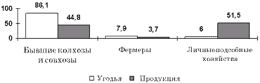 Основные субъекты аграрного рынка Важнейшей особенностью аграрного рынка России является исключительно слабое распространение арендных отношений в сельском хозяйстве. Обработку земли обычно ведет сам владелец. При этом существуют три основных типа хозяйств. Акционерные общества и товарищества созданы на месте бывших колхозов и совхозов. Как видно на рис. 13.4, именно этому типу предприятий принадлежит подавляющая часть (86%) сельскохозяйственных угодий страны. Лидируют они, хотя и с гораздо меньшим отрывом (45%), и по объему производимой продукции.