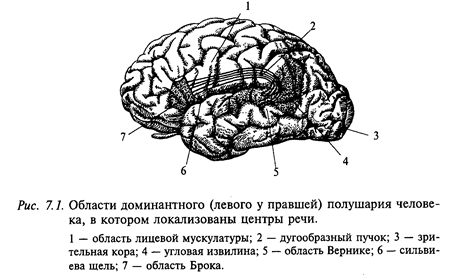 Левое полушарие становится доминантным по речевой функции у правшей, тогда как правое остается субдоминантным. В коре левого полушария у правшей выделяют две зоны, имеющие отношение к речи: зона Брока и зона Вернике (рис. 7.1). Речь представляет собой высшее достижение эволюции, служащее уникальным средством общения. Одна из принципиальных особенностей речи состоит в том, что она одновременно является орудием мышления, позволяющим осуществлять операции отвлечения и обобщения. И. П. Павлов (1932) выделил речевую функцию в особую категорию высшей нервной деятельности, назвав ее второй сигнальной системой. В отличие от общей для человека и животных первой сигнальной системы, связанной с анализом сигналов внешнего мира, вторая сигнальная система оперирует со словами, которые служат сигналами конкретных сигналов и представляют собой отвлечение от действительности.