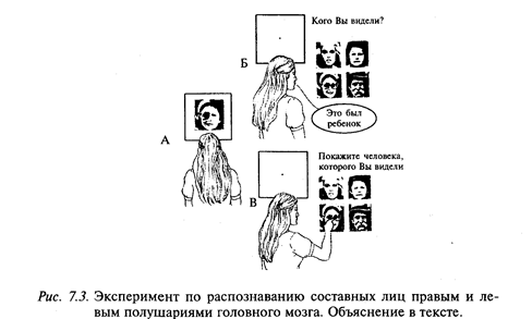 Применение методических приемов, построенных на том, что информация в правом поле зрения у человека целиком поступает в левое полушарие и наоборот, позволило установить доминирование левого полушария в восприятии письменного изображения букв и слов и правого полушария-в локализации предметов в пространстве. Исследования показали, что узнавание лиц также происходит в основном правым полушарием. Эксперимент состоял в следующем. Перед испытуемым находился экран с точкой в центре для фиксации взора. Кроме того, испытуемый надевал специальные призматическое очки. Благодаря этим приемам изображение, находящееся справа, проецировалось в левое полушарие, а изображение слева в правое полушарие (рис. 7.3). Испытуемому на экране предъявляют составные лица. Например, справа от точки фиксации половина лица мальчика, а слева половина лица старика. Изображение предъявляют на короткое время (0,1-0,5 с), чтобы испытуемый не смог рассмотреть изображение. Затем ему предъявляют набор различных фотографий и просят выбрать ту, которая предъявлялась. Он выбирает ту фотографию, изображение которой поступало в правое полушарие. Однако если испытуемого просили описать изображение словами, то он описывал то, которое проецировали в левое полушарие. У большинства людей в связи с левосторонней локализацией речевых центров имеет место специальный вид двигательного доминирования в виде жестикуляций правой руки во время произнесения слов. Этот вид полушарного доминирования может быть выражен соотношением 3:1. ЗАКЛЮЧЕНИЕ Мозг человека и современный мир. Судя по ископаемым остаткам, семейства Hominidae (люди) и Pongidae (человекообразные обезьяны) разделились в эоцене. В конце плейстоцена (2-3 млн лет назад) появился первый настоящий представитель гоминид австралопитек. Вес его мозга составлял примерно треть от веса мозга современного человека, он ходил (прямохождение), использовал орудия и охотился группами. Эта форма существовала вплоть до ледникового периода (примерно 700 тыс. лет тому назад). Примерно 600 тыс. лет назад появился Homo erectus. Этот вид имел объем черепа около 1000 см3, что примерно вдвое больше, чем у австралопитека. Он уже сам изготавливал каменные орудия. Поскольку в местах нахождения ископаемых остатков, как правило, обнаруживали кости крупных животных, видимо, убитых охотниками, можно думать, что он жил и охотился хорошо организованными группами. Наличие орудий и хорошо организованных групп позволяет предполагать какую-то форму речи. Все это указывает, что Homo erectus значительно ближе к современному человеку, чем австралопитек. Первые люди, не отличимые от нас, появились примерно 35-40 тыс. лет назад, во время последнего ледникового периода. Неизвестно, как произошло замещение примитивных людей современными людьми-дальнейшей эволюцией, гибридизацией или вымиранием. Появление людей современного типа сопровождалось быстрым распространением и совершенствованием культуры, увеличением ее разнообразия. Они хоронили своих покойников, укладывая вокруг тела утварь и цветы, поэтому есть основания предполагать, что они верили в загробную жизнь и имели какую-то религию. Это уже был Homo sapiens- современный человек. В эволюции семейство Hominidae обозначилась тенденция к развитию интеллектуальных способностей. Прежде всего происходило резкое увеличение объема голов