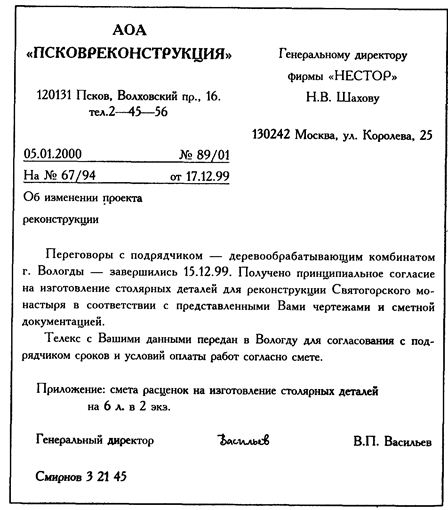 Письмо — обобщенное название различных по содержанию документов, служащих средством общения между учреждениями в процессе осуществления их деятельности. Даже в случаях переписки между частными лицами и учреждением ее содержание касается управленческих вопросов. Письмо — самый распространенный способ обмена информацией, оно объединяет огромную группу самых различных по содержанию документов. Письма составляют большую часть входящих и исходящих документов любого учреждения. Имеется множество разновидностей писем: сопроводительные, информационные, гарантийные, рекламные, претензионные, арбитражные, письма-подтверждения, письма-напоминания, письма-извещения, письма-просьбы и т.д. В письмах выражают поздравления, пожелания, приветствия в торжественных случаях. Письма направляют в знак проявления участия и выражения соболезнования в драматических и трагических ситуациях. Письмо оформляют на специально предназначенном для этого вида документа бланке формата А4, если текст не превышает семи строк, то используют формат А5. Текст письма строят по схеме: введение (приводятся мотивы составления письма, ссылки на события, факты, решения вышестоящих учреждений и другие факторы, послужившие основанием для составления письма); доказательства (обоснование вопроса, изложенного в письме); заключение (излагаются выводы, предлагаются решения). В отдельных случаях письма могут содержать одну заключительную часть текста без пояснений. Письмо должно быть посвящено одному вопросу, что упрощает операции по обработке писем и ускоряет исполнение в той организации, куда они адресованы. По объему письмо не должно превышать одну машинописную страницу. К тексту письма предъявляются требования: ясность, четкость, краткость изложения, так как цель составления и направления писем сводится, как правило, к побудительным мотивам. Текст письма должен содержать достаточно обоснованные аргументы и полную информацию, позволяющие адресату принять решение по поднятому в письме вопросу. В письмах не допускаются рассуждения, повествования, домыслы, неуместные лишние детали и общие места, так как многословие и большой объем документа не способствуют усвоению сути, основного смысла письма. Тон письма в любом случае должен быть нейтральным. В письмах не следует проявлять ярко выраженный, эмоциональный тон, придавать им личностный характер, так как письмо является официальным документом, исходит от организации, предназначено для делового общения. Служебные письма пишут в доброжелательном тоне, обязательно в вежливой форме. Недопустимо проявление грубости, иронии, насмешки, даже в тех случаях, когда речь идет о принципиальном несогласии. Категорический отказ или категорическое требование можно выразить прямо, но вежливо. Самые общие рекомендации по составлению текста служебных писем — избегать вычурности слогаю, оборотов ложной вежливости («не откажите в любезности», «с глубоким почтением»). Уважение к адресату, внимание к затронутым вопросам, заинтересованность в совместной работе и т.п. можно выразить деепричастными оборотами: «тщательно рассмотрев Ваше предложение», «детально ознакомившись с Вашим проектом», «внимательно изучив Ваши замечания»). Нейтральность тона может быть достигнута использованием деепричастных оборотов для форму