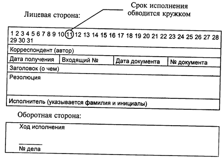 Преимущества карточной системы регистрации позволяют значительно поднять уровень организации делопроизводственного обслуживания в учреждении. Форма карточки (РКК — регистрационно-контрольной карточки) и расположение в ней реквизитов могут быть определены в самом учреждении и записаны в инструкцию по делопроизводству. Можно предложить следующую форму регистрационной карточки на формате А5 (148×210) или А6 (105×148): Вычертив на формате А5 или А6 такую форму карточки, ее размножают на ксероксе, выбрав достаточно плотную бумагу. Для различных регистрируемых групп документов можно использовать карточки разных цветов, цветовые полосы по верхнему полю или по диагонали. Для ведения карточной системы регистрации в ручном режиме необходимо иметь тираж карточек на год и, как минимум, два картотечных ящика для хранения карточек: в сроковой контрольной картотеке и справочной картотеке. Количество экземпляров заполняемых регистрационных карточек определяется учреждением. Как правило, таких карточек заполняется, как минимум, две. Заполнив карточку, одну из них помещают в сроковую картотеку, другую — в информационно-справочную, а документ передают исполнителю для работы с ним. Но чаще изготавливают три экземпляра карточки. Из них два ставят в картотеки (справочную и контрольную), а третий экземпляр передают с документом исполнителю. Если справочные картотеки строят по различным признакам, например, по корреспондентам, регионам или по вопросам, то соответственно увеличивают количество карточек, чтобы экземпляров хватило для каждой картотеки. В этом случае количество экземпляров карточки в крупных учреждениях возрастет до пяти-шести. Естественно, что создание и ведение больших картотек — это трудоемкая работа и она была поставлена лишь в отдельных учреждениях, имеющих хорошо организованную делопроизводственную службу. Избавиться от громоздких картотек и организовать трудоемкую информационно-справочную работу практически в любом учреждении позволило внедрение компьютерных технологий.