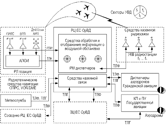 Рисунок 2.8 — Структурно-функциональная схема МАСУВД На радиолокационной позиции РЦ УВД размещены средства наблюдения за воздушной обстановкой и получения координатной, полетной и пеленговой информации о ВС, находящихся в зоне обзора ПРЛС, ВРЛС и в зоне радиоприема информации от экипажей ВС, автоматическим радиопеленгатором (АРП). С помощью ПРЛС, она же обзорная РЛС (ОРЛС), происходит обнаружение ВС по «эхо — сигналу» и определение его полярных координат: наклонной дальности и азимута. В качестве ПРЛС используются РЛС типа «Утес» или «Скала». Дальность обнаружения и сопровождения ВС в зависимости от высоты полета находится в пределах 250…400 км. Эта дальность круговой зоны обзора ВП определяет границы контролируемого ВП РЦ УВД. В качестве ВРЛС используется ВРЛ типа «Корень». Дальность обнаружения и получения пеленга на ВС не менее, чем у ПРЛС. Высота полета ВС в качестве третьей координаты передается с борта по каналу ВРЛС. Координатная, полетная и пеленговая информация обрабатывается в аппаратуре АПОИ и передается в устройство обработки и отображения информации РЦ ЕС ОрВД. Дальность радиотелефонной связи диспетчеров центра с экипажами ВС в УКВ диапазоне волн составляет не менее 450 км. Средства отображения и обработки информации РЦ ЕС ОрВД включают совмещенные индикаторные устройства, которые позволяют отображать: — координатные аналоговые отметки от РЛС или синтетические отметки в результате цифровой обработки координат; — формуляры сопровождения (ФС) с полетной информацией; — векторы-указатели, соединяющие ФС с отметкой от ВС; — электронные карты с наземной инфраструктурой. В РЦ УВД могут использоваться несколько типов такой аппаратуры: «Страница», «Строка-2», «Строка-Ц». Устройства обработки координатной информации позволяют одновременно производить автосопровождение до 30 воздушных судов. Суточное и текущее планирование ВД производится диспетчерами вручную. Прием заявок, получение и отправка сообщений по УВД осуществляется по телефонным и телеграфным каналам связи.