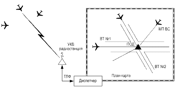 Рисунок 2.10 — Схема маршрутов полетов ВС В общем случае текущее планирование включает следующие процессы: — прием сообщений от пользователей ВП об изменении планов полетов ВС; сообщений о состоянии системы УВД, радиотехнических средств и аэродромов смежных центров УВД; — внесение изменений в «активные» планы в связи с необходимостью выполнения срочных вылетов ВС или входом в ВП района незапланированного ВС из другого района или зоны и выработка в связи с этим совокупности новых бесконфликтных ПВТ полета ВС; — согласование изменений суточного плана с взаимодействующими системами; — рассылка сообщений в соответствующие органы УВД; — активизация плана полетов, распределение плана по секторам управления; — отображение информации текущего плана на индикаторах воздушной обстановки (ИВО), на табличных знаковых индикаторах (ТЗИ) и на специальных бумажных носителях (стрипах); — выявление и отображение возникающих конфликтных ситуаций (КС); — пересчет текущего плана в процессе устранения КС. Текущее планирование осуществляется в реальном масштабе времени и связано с непосредственным управлением (НУ) ВС в воздушном пространстве. Непосредственное управление ВД включает в себя выполнение диспетчерами центров ЕС ОрВД или лицами боевых расчетов различных КП следующих функций: — согласование условий приема ВС на управление; — обеспечение движения ВС по выработанной бесконфликтной ПВТ полета; — коррекция движения ВС в случае отклонения его от расчетной траектории, отказа аэронавигационных средств, изменения метеоусловий и возникновения конфликтных ситуаций; — согласование измененной траектории со смежными центрами; — выдачу экипажам ВС разрешений, указаний и другой информации. Процесс непосредственного управления протекает в реальном масштабе времени с момента согласования приема ВС на управление и прекращается после посадки или передачи управления другому органу УВД. В зависимости от способов измерения параметров продольного эшелонирования ВС непосредственное управление подразделяется на следующие виды: — процедурное управление, при котором осуществляется контроль за выдерживаем временных интервалов движения между ВС; — радиолокационное управление (РЛУ), при котором контроль за выдерживанием установленных дистанций между ВС осуществляется по данным радиолокационных измерений. Процедурное управление ВД на ВТ и МВЛ осуществляется на основе текущего плана полета и сообщений экипажами ВС о своем местоположении, высоте и расчетном времени прохождения контрольных ориентиров и пунктов обязательных донесений (ПОД). Сущность процедурного управления ВД показана на рисунке 2.11. На основании сообщений с бортов ВС и планов полета диспетчер определяет наличие конфликтной ситуации в точке пересечения их маршрутов. При отклонении временных интервалов от допустимых осуществляется передача экипажам ВС на борт команд об изменении режимов полета. Процедурное управление на маршруте, проходящем через смежные районы центров УВД, осуществляется в следующей последовательности: — прием сообщений от смежного центра УВД и передача им ВС на управление; — установление диспетчером связи с ВС, входящим под его управлением, и получение информации о местоположении ВС, условий полета, времени пролета контрольных ориентиров;
