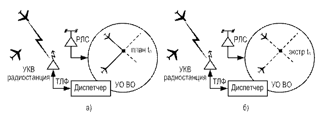 Рисунки 2.12 — Сущность радиолокационного управления по траекториям текущих планов (а) и с экстраполяцией траекторий ВС (б) Необходимо отметить, что если существует отклонение от плана полетов при РЛУ по траекториям текущих планов и невозможно скорректировать план, то диспетчер переходит на РЛУ по экстраполированным траекториям.