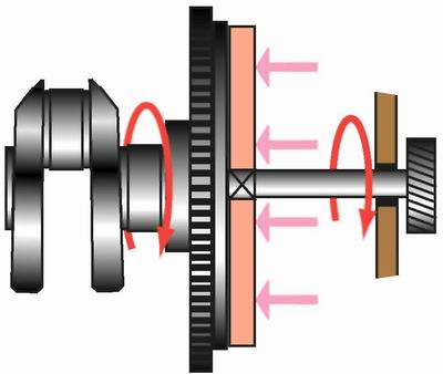 Рис. 37. Сцепление включено Давайте подумаем, как решить эту задачу. Представьте, что вы опоздали на поезд, который уже начал движение. При грамотных действиях сначала вы его догоняете, двигаясь параллельно, затем хватаетесь за поручень, и когда ваша скорость уравняется со скоростью поезда, то можно уже и запрыгивать в вагон. Но вам может присниться кошмарный сон, в котором вы, двигаясь наперерез поезду, пытаетесь сразу попасть в движущийся вагон. Конечно промахиваетесь и не попадаете в больницу только потому, что вовремя просыпаетесь в холодном поту. Зато после этого начинаете всегда правильно отпускать педаль сцепления только в три этапа. На первом этапе работы по включению сцепления – приотпускаем педаль, то есть даем возможность пружинам нажимного диска подвести ведомый диск к маховику до их легкого соприкосновения (догнали поезд). За счет сил трения диск, проскальзывая некоторое время относительно маховика, тоже начнет вращаться, а ваш автомобиль – потихоньку ползти. На втором этапе – удерживаем ведомый диск от какого-либо перемещения в средней позиции в течение двух-трех секунд для того, чтобы скорость вращения маховика идиска уравнялись (ухватились за поручни вагона). Машина при этом немного увеличивает скорость движения. На третьем этапе – маховик вместе с нажимным и ведомым дисками уже вращаются вместе без проскальзывания и с одинаковой скоростью, стопроцентно передавая крутящий момент к коробке передач и далее на ведущие колеса автомобиля (запрыгнули в вагон). Это соответствует состоянию механизма сцепления включено, автомобиль движется. Теперь остается только полностью отпустить педаль сцепления и убрать с нее ногу. Если в начале движения педаль сцепления резко бросить, то автомобиль "прыгнет" вперед, а двигатель заглохнет. В худшем варианте что-нибудь еще и сломается, так как в этот момент возникает сильная ударная волна, которая многократно увеличивает нагрузки на все детали двигателя и агрегаты трансмиссии. Действия водителя по выключению и включению сцепления в течение поездки (при стартах с места, остановках и переключениях передач) повторяются многократно, особенно в условиях городского движения. Если вы освоите работу педалью сцепления в три этапа, то позже это войдет в незаметную полезную привычку, которая обеспечит плавность хода автомобиля, комфорт пассажирам и увеличение ресурса не только деталей сцепления, но и всего автомобиля в целом.