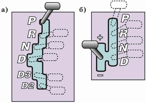 Рис. 43. Схема положений рычага селектора автоматической коробки передач Рычаг селектора имеет следующие основные положения: Р, R, N, D. Есть также положения D3 (или S) и D2 (или L) (рис. 43 а). Могут быть и дополнительные режимы, например W (winter – зима). Давайте разберемся с этими буквами, одновременно поглядывая на схему переключения рычага селектора (рис. 43 а). Р (парковка) – в это положение рычаг можно переводить только после полной остановки автомобиля и фиксации его стояночным тормозом. Именно в этом положении следует оставлять машину на стоянке, а также осуществлять запуск двигателя. R (задний ход) – можно включать, удерживая педаль тормоза нажатой и только после полной остановки автомобиля (иначе не избежать поломок). N (нейтральное положение) – означает, что крутящий момент от двигателя не передается ведущим колесам. При этом положении рычага разрешается запуск двигателя. Во время движения автомобиля переводить рычаг селектора в положение "N" нельзя, возможна поломка коробки передач! D (движение) – при этом положении рычага селектора обеспечивается движение автомобиля в нормальных условиях. В этом режиме передачи меняются по мере увеличения или уменьшения скорости движения автомобиля автоматически, без участия водителя. D3 (S) – диапазон пониженных передач. Обычно включается на дороге с небольшими подъемами и спусками. Торможение двигателем более эффективно, чем в положении D. D2 (L) – второй диапазон пониженных передач. Включается водителем в тяжелых дорожных условиях (горы, бездорожье и тому подобное). Торможение двигателем при этом более эффективно, чем в положении S. Перевод рычага селектора автоматической коробки передач из положения D в положение D3 или D2 и обратно может производиться во время движения автомобиля. Автоматические коробки передач последних лет выпуска могут дополнительно оборудоваться переключателями режимов разгона: N – нормальный, Е – экономичный, S – спортивный. Существуют также "автоматы" с режимом ручного переключения передач. При переходе на такой режим необходимо перевести рычаг селектора в дополнительный "коридор" (рис. 43 б). Кратковременно отклоняя рычаг к отметке " + " или "–", водитель имеет возможность последовательно переключать передачи в порядке повышения или понижения. Для начала движения автомобиля с автоматической коробкой передач следует, нажав правой ногой на педаль тормоза, рукой перевести рычаг селектора из положения Р, R или N в положение D (движение), и затем выключить стояночный тормоз. При отпускании педали тормоза (правой ногой) автомобиль сразу же начинает движение! Для увеличения скорости движения надо лишь перенести правую ногу на педаль "газа" и плавно ее нажать. Передачи при разгоне автомобиля будут меняться автоматически. Для снижения скорости движения достаточно ослабить усилие на педали "газа" или просто ее отпустить, при этом передачи будут самостоятельно переключаться в нисходящем порядке. Если вам необходимо снизить скорость более активно или вообще остановиться, то вы должны перенести правую ногу на педаль тормоза и мягко с ней поработать. Левая нога в управлении автомобилем участия не принимает! Для начала движения после кратковременной остановки (или после снижения скорости) снова переносим правую ногу с педали тормоза на педаль "газа" и автомобиль начинает (продолжае