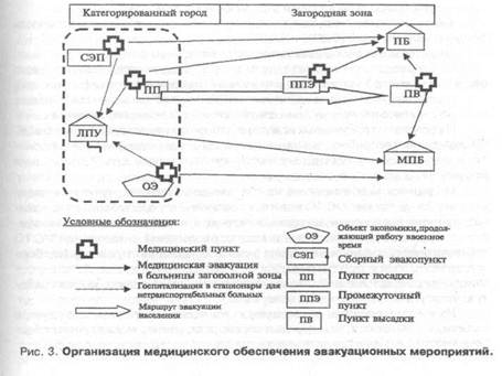 При проведении эвакомероприятий перед медицинской службой ГО стоят следующие задачи: 1. Организация медицинского обеспечения населения на всех этапах эвакуации и в местах расселения. 2. Эвакуация медицинских учреждений из категорированных городов в загородную зону. 3. Вывод медицинских формирований ГО в загородную зону. 4. Организация укрытия и лечения нетранспортабельных больных. 5. Развертывание коечной сети в загородной зоне за счет эвакуированных больниц. 6. Организация медицинского обеспечения рабочих и служащих объектов, продолжающих работу в военное время. 7. Защита медицинского персонала и больных от поражающих факторов оружия массового поражения и обычных средств ведения войны. Успешное выполнение задач по медицинскому обеспечению эвакуации населения достигается заблаговременным четким планированием. Для планирования медицинского обеспечения эвакуационных мероприятий штабы МС ГО должны располагать определенными исходными данными, которые они получают от соответствующего органа управления ГО ЧС. Исходные данные должны содержать следующие сведения: численность эвакуируемого населения (в том числе детских учреждений и детей) в целом по городу и отдельно по его районам; места расположения, количество и суточная пропускная способность сборных эвакопунктов (СЭП); маршруты и способы эвакуации населения; места расположения пунктов посадки (ПП) и количество эвакуируемого населения в каждой автоколонне или железнодорожном составе (теплоходе); дислокация промежуточных пунктов (ППЭ) эвакуации и пунктов высадки; районы расселения и численность населения, подлежащего эвакуации. На основании полученных исходных данных соответствующие штабы МС ГО определяют потребность в различных категориях медицинского персонала, в медицинских средствах и санитарном транспорте для обслуживания населения на этапах и путях эвакуации. Медицинское обеспечение на сборных эвакопунктах, пунктах посадки организует начальник МС ГО категорированного города (городского района); на путях следования, на промежуточных пунктах эвакуации, эвакопри-емных пунктах, пунктах высадки и местах расселения — начальник МС ГО соответствующего сельского района (некатегорированного города). На сборных эвакопунктах и пунктах посадки в специально выделенных по плану помещениях развертываются медицинские пункты, организующие свою работу круглосуточно до окончания эвакуации. На пунктах посадки, организуемых на железнодорожных станциях, в морских и речных портах и крупных аэропортах, медицинские пункты обеспечиваются силами и средствами ведомственных медицинских служб. Для работы в медицинских пунктах СЭП, ПП выделяется медицинский персонал из расчета: 2 средних медицинских работника, 1 санитарка (санд-ружинница), 1 дезинфектор в смену. В-отдельных случаях предусматривается выделение врача. Для перевозки пораженных и больных в медпункте имеется 1 санитарный автомобиль Нуждающиеся в стационарном лечении больные и пораженные из медпунктов СЭП и ПП эвакуируются в ближайшие лечебные учреждения загородной зоны. Нетранспортабельных больных госпитализируют в стационары для нетранспортабельных больных, развернутые в убежищах ЛПУ категорирован-ных городов. Эвакуация таких больных осуществляется машинами станций скорой медицинской помощи или 