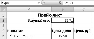 Рис. 6.32. Пример прайс-листа Задание для самостоятельного выполнения Создайте еще одну таблицу начисления зарплаты, которая рассчитывается следующим образом: ? для каждого сотрудника установлена месячная ставка, которую он получит, если отработает установленное количество рабочих дней; ? если сотрудник отработал меньше дней, чем положено, то его зарплата рассчитывается так: зарплата=ставка*отработано_дней/рабочих_дней_в_месяце; ? сумму налогов примите равной 13 %; ? сумму к выплате для каждого сотрудника нужно перевести в доллары по текущему курсу. Пример таблицы показан на рис. 6.34. В ячейки диапазона D5:G9 следует ввести соответствующие формулы (на рисунке этот диапазон выделен).