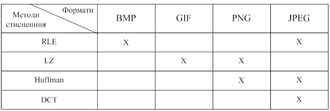 Таблиця 3.1. методи стиснення що використовуються деякими форматами графічних файлів