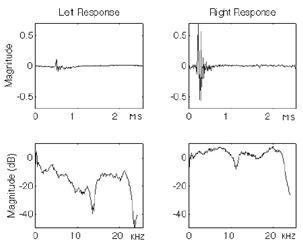 Рис.4.6. Частотні характеристики людських вух при асиметричному розташуванні джерела звуку. Багаточисельні вимірювання показують значні зміни частотних характеристик в залежності Для реалізації тривимірного звуку фірмою Microsoft було створено програмне забезпечення звичайний стереозвук від близько розташованих одна від одної колонок, віртуально розмістивши їх на оптимальній для проявлення стереоефекта відстані від слухача. При цьому реальні колонки взагалі не потрібно пересувати - все зробить 3D звуковий процесор. На сьогодні на ринку є дешеві і дуже потужні процесори обробки сигналів (DSP), таких як Крім того, процесори обробки звукових сигналів більш вузького застосування випускаються фірмами Vortex Chips (Aureal AU8820, Aureal AU8830) і E-mu (EMU10k). Система команд цих процесорів значно простіше набору інструкцій AD21160 і орієнтована на табличний синтез музичних звуків (64..128 голосів), електронні ефекти, різноманітну фільтрацію та тривимірний звук (до 32 джерел звуку). DSP виробляються також фірмами Motorola і Texas Instruments і мають параметри, що не дуже сильно поступаються наведеним вище пристроям. Сучасні звукові карти, що містять подібні DSP, здатні в реальному часі реалізовувати