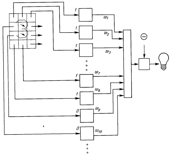 Персептрон обучают, подавая множество образов по одному на его вход и подстраивая веса до тех пор, пока для всех образов не будет достигнут требуемый выход. Допустим, что входные образы нанесены на демонстрационные карты. Каждая карта разбита на квадраты и от каждого квадрата на персептрон подается вход. Если в квадрате имеется линия, то от него подается единица, в противном случае – ноль. Множество квадратов на карте задает, таким образом, множество нулей и единиц, которое и подается на входы персептрона. Цель состоит в том, чтобы научить персептрон включать индикатор при подаче на него множества входов, задающих нечетное число, и не включать в случае четного.