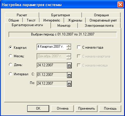 Период, за который формируются отчеты, задается с помощью команды Сервис \ Параметры \ Бухгалтерские итоги. Установленный период итогов отображается в нижнем правом углу окна программы.