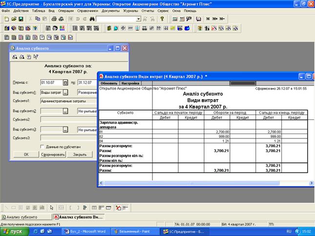 4.1 Принцип подведения итогов в системе «1C: Бухгалтерия». В ходе учета хозяйственных операций система «1С: Бухгалтерия» накапливает данные в информационной базе. Прежде чем перейти к анализу этих данных, нужно произвести расчет бухгалтерских итогов по необходимый квартал и указать период подведения итогов внутри диапазона рассчитанных итогов. Расчет итогов. Диапазон расчета бухгалтерских итогов задается с помощью команды Управление бухгалтерскими итогами из меню Операции. Чтобы изменить границы периода поддержки итогов необходимо установить квартал, до которого требуется рассчитать итоги (по умолчанию – квартал, следующий за последним рассчитанным) и нажать кнопку Установить расчет. Будут рассчитаны итоги за период, добавленный к ранее рассчитанному периоду. Полный пересчет итогов выполняется после изменения настроек плана счетов или если сбой компьютера при работе с программой нарушил (или мог нарушить) текущее состояние итогов.