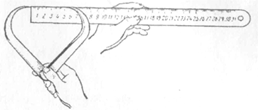 Steel rules (Fig. 11) serve for determining the length and sometimes the depth of the part to be measured. Steel rules are graduated in millimeters, but in the USA and England they are graduated in thirty-seconds and sixty-fourths of an inch1. The outside (Fig. 12) calipers are the simplest instruments for measuring external diameters of the part. The outside caliper consists essentially of two curved legs. The inside calipers are used for determining the internal diameters of the part. Its construction is almost similar to that of the outside calipers. Sometimes the outside calipers may be used for measuring internal diameters of the part. The outside and inside caliper measurements may be read by placing the legs of the calipers on a rule and placing one leg and the end of the rule against a flat surface as shown in Fig. 11.