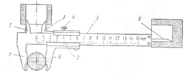 Fig. 13. Vernier Calipers: 1, 2, 3, 8 -jaws; 4 - adjusting screw; 5 - primary scale; 6 - depth rod; 7 - frame with vernier