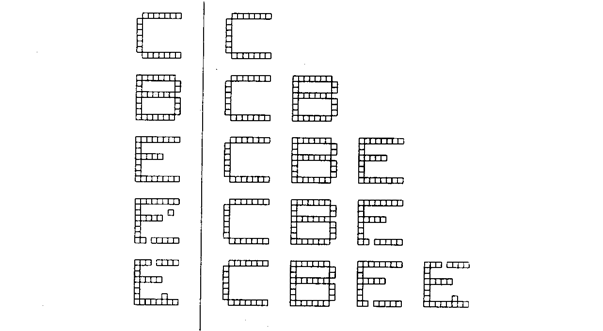 Рис. 8.6. Процесс обучения APT На рис. 8.6 показан типичный сеанс обучения сети APT. Буквы показаны состоящими из маленьких квадратов, каждая буква размерностью 8x8. Каждый квадрат в левой части представляет компоненту вектора Х с единичным значением, не показанные квадраты являются компонентами с нулевыми значениями. Буквы справа представляют запомненные образы, каждый является набором величин компонент вектора Т j. Вначале на вход заново проинициированной системы подается буква «С». Так как отсутствуют запомненные образы, фаза поиска заканчивается неуспешно; новый нейрон выделяется в слое распознавания, и веса Т j устанавливаются равными соответствующим компонентам входного вектора, при этом веса В j представляют масштабированную версию входного вектора. Далее предъявляется буква «В». Она также вызывает неуспешное окончание фазы поиска и распределение нового нейрона. Аналогичный процесс повторяется для буквы «Е». Затем слабо искаженная версия буквы «Е» подается на вход сети. Она достаточно точно соответствует запомненной букве «Е», чтобы выдержать проверку на сходство, поэтому используется для обучения сети. Отсутствующий пиксель в нижней ножке буквы «Е» устанавливает в 0 соответствующую компоненту вектора С, заставляя обучающий алгоритм установить этот вес запомненного образа в нуль, тем самым воспроизводя искажения в запомненном образе. Дополнительный изолированный квадрат не изменяет запомненного образа, так как не соответствует единице в запомненном образе. Четвертым символом является буква «Е» с двумя различными искажениями. Она не соответствует ранее запомненному образу (S меньше чем r), поэтому для ее запоминания выделяется новый нейрон. Этот пример иллюстрирует важность выбора корректного значения критерия сходства. Если значение критерия слишком велико, большинство образов не будут подтверждать сходство с ранее запомненными и сеть будет выделять новый нейрон для каждого из них. Это приводит к плохому обобщению в сети, в результате даже незначительные изменения одного образа будут создавать отдельные новые категории. Количество категорий увеличивается, все доступные нейроны распределяются, и способность системы к восприятию новых данных теряется. Наоборот, если критерий сходства слишком мал, сильно различающиеся образы будут группироваться вместе, искажая запомненный образ до тех пор, пока в результате не получится очень малое сходство с одним из них. К сожалению, отсутствует теоретическое обоснование выбора критерия сходства, в каждом конкретном случае необходимо решить, какая степень сходства должна быть принята для отнесения образов к одной категории. Границы между категориями часто неясны, и решение задачи для большого набора входных векторов может быть чрезмерно трудным. В работе [2] предложена процедура с использованием обратной связи для настройки коэффициента сходства, вносящая, однако, некоторые искажения в результате классификации как «наказание» за внешнее вмешательство с целью увеличения коэффициента сходства. Такие системы требуют правил определения, является ли производимая ими классификация корректной.