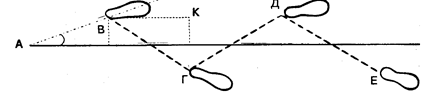 Рис. 15. Дорожка следов обуви: АБ — линия направления движения; ВГДЕ — линия ходьбы; ВАБ — угол шага; ВК — длина шага; КГ — ширина шага