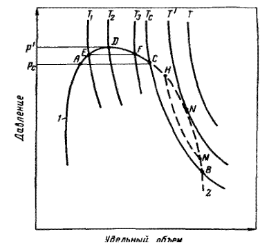 Рис. 5. Типовые изотермы многокомпонентных углеводородных смесей вблизи критической области. 1 — кривая точек парообразования; 2 — кривая точек конденсации. В области выше критической с изменением температуры и давления в многокомпонентной системе происходят необычные фазовые превращения. Чтобы убедиться в этом, рассмотрим изобарическое расширение насыщенной газом жидкости по линии Необычные процессы испарения и конденсации возможны также и при температурах выше критических - в области Рассмотренные необычные процессы фазовых превращений двух и многокомпонентных систем в области выше критической называются процессами обратного или ретроградного испарения и конденсации.