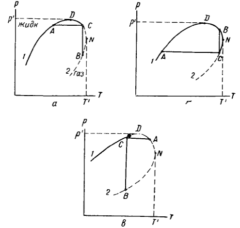 Рис. 6. Различные виды фазовых диаграмм. 1 — кривая точек парообразования; 2 — кривая точек конденсации. Фазовая диаграмма, приведенная на рис. 5, типична для многих систем. Однако условия возникновения ретроградных явлений и вид Если критическая область характеризуется диаграммой (рис. 6, б), где критическая точка Обычно критическая точка находится справа от максимального давления, при котором могут одновременно сосуществовать жидкая и газовая фазы, когда в углеводородной смеси массовая концентрация гептана и более тяжелых фракций высокая, а метана низкая (см. рис. 4, б). Ретроградные явления характеризуются диаграммой вида (рис. 6, в), когда максимальное давление Из рис. 5 и 6 следует, что изотермические ретроградные явления происходят только при температурах выше критической и ниже максимальной двухфазной температуры (крикондентермы). Изобарические процессы испарения и конденсации наблюдаются между критическим и максимальным двухфазным давлением (криконденбарой). Ретроградные процессы испарения и конденсации сопровождаются непрерывным изменением состава и объемного соотношения жидкой и паровой фаз. Например, по диаграмме (рис. 7), соответствующей фазовой диаграмме, приведенной на рис. 6, в, можно проследить за течением процессов обратного испарения и конденсации.