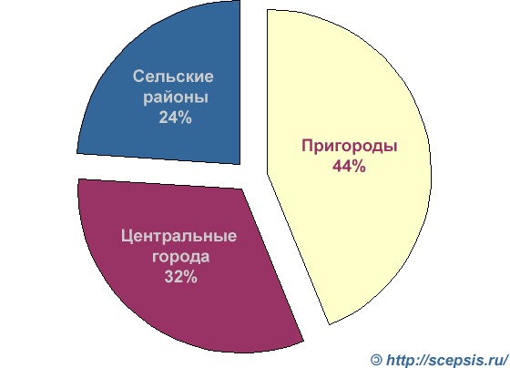 СТРУКТУРА МЕТРОПОЛИИ В США Район метрополии включает один или несколько крупных городов и прилегающие к ним пригороды. Как видно из схемы 8-2, 32 процента всего населения США проживают в центральных городах, в то время как 44 процента являются жителями пригородов. Остальные 24 процента живут за пределами центральных районов. В следующем разделе мы рассмотрим два основных элемента центральной структуры: центральный город и пригород. Схема 8-2. Соотношение населения США, проживающего в центральных городах, пригородах, и сельских районах, 1984 г.