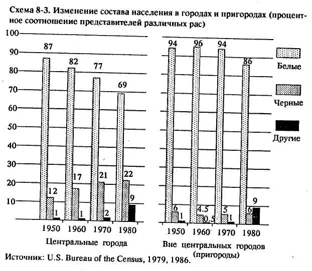Источник. U.S. Bureau of the Census, 1986. Для центральных городов США характерны некоторые общие черты и тенденции. Исторически сложилось так, что на особенности их развития большое влияние оказал социоэкономический статус их жителей. Статистические данные свидетельствуют, что среди жителей центральных городов преобладают люди, имеющие сравнительно низкий достаток, уровень образования и профессиональной подготовки, в то время как индивидуумы с более высокими доходами и уровнем образования предпочитают жить в пригородах. В 1973 г. Шноре показал, что такая миграция обусловлена особенностями центрального города. Он обнаружил, что социоэкономическое различие между пригородами и центральными городами становится значимым лишь в тех случаях, когда города становятся крупными, старыми и неспособными расширяться (Шноре, 1973). С 30-х годов наметилась тенденция переселения групп цветного населения в центральные города. В 1980 г. в них проживало 58 процентов негров и лишь 25 процентов белых. Однако в 70-е годы значительно возросла миграция /250/ негров в районы пригородов. В связи с этим возникла следующая проблема: в то время как растет миграция негров среднего достатка в пригороды, в городах остаются главным образом бедные (схема 8-3). Это приводит к обострению финансовых и социальных проблем центрального города. Население городов отличается многообразием образа жизни. Ганс (1962) выделил пять категорий жителей городов, различающихся по образу жизни, обусловленному их классовой принадлежностью. Космополиты. Люди этой категории проявляют интерес к высокой культуре. Они активно участвуют в культурных мероприятиях города. Кроме того, они стремятся к контактам с представителями своего круга из других городов. Хотя большинство космополитов принадлежат к богатой элите, нередко покровители искусств общаются с нищими художниками. Не состоящие в браке и состоящие в браке, но не имеющие детей. Речь идет об активных молодых людях. Они обеспечены работой, активно участвуют в социальной жизни, часто посещают дискотеки и участвуют в различных культурных мероприятиях. Некоторые из них в конце концов вступают в брак, в то время как другие всю жизнь остаются свободными и не связывают себя детьми. Этнические поселения. В них живут группы иммигрантов: итальянцы, испанцы, греки, корейцы и т.д. Они сохраняют многие обычаи своей родины. Хотя их кварталы не отличаются фешенебельностью, они удобнее для жилья, чем захламленные трущобы. Фактически эти группы представляют собой высокоорганизованные общности (часто экономически несколько отсталые), гармонически вписывающиеся в городскую структуру. Обездоленные. К этой категории относятся безработные, бродяги, нищие, пожилые люди. Все они доведены до крайней бедности. Многие больны физически /251/ или психически, лишены заботы и поддержки семьи и друзей. Обездоленные обычно живут в трущобах или ночлежках. "Попавшие в капкан". Подразумеваются жители ночлежек или инвалиды. По своему социальному статусу они оказались на дне общества и почти потеряли надежду снова вернуться к нормальной жизни. Некоторые члены этой группы владеют нищенским имуществом, почти полностью обесценившимся. Экономические факторы мешают "обреченным" гражданам вырваться из перенаселенных или разрушающихся районов города. Эта категория включает много по