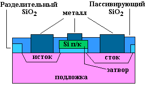 Назначение и требования к металлизации Процесс металлизации заключается в реализации межкомпонентных соединений с низким сопротивлением и создании контактов с низким сопротивлением к высоколегированным областям p- и n- типа и слоям поликристаллического кремния. Пример реализации металлических соединений приведен на схеме поперечного сечения полевого МОП транзистора (см. рис. 1).