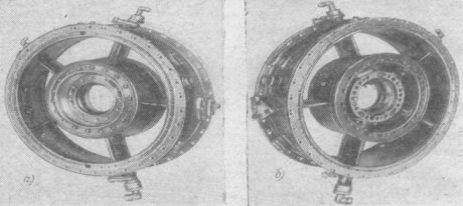 Рис. 4.14. Третья опора роторов двигателя: а — вид спереди слева; б — вид сзади слева Корпус 9 опоры сварен из листовой стали и состоит из силовой части и кожуха, образованного из обечаек с обтекателями стоек. Кожух образует в опоре проточную часть газового потока. Наружная и внутренняя обечайки силовой части корпуса соединены пятью радиальными равнорасположенными полыми стойками через фермы и манжеты. Кожух из обечаек с обтекателями предохраняет силовую часть корпуса опоры от непосредственного воздействия высокой температуры газового потока. В корпусе 9 опоры с помощью крышек 1 к 11 крепится стальное гнездо 2 роликового подшипника, имеющее эллипсные отверстия для слива масла. Наружное кольцо роликоподшипника 4 монтируется в гнезде 2 подшипника с осевым зазором, необходимая величина которого достигается подбором регулировочного кольца 13. Между наружным кольцом подшипника и гнездом подшипника монтируется упругий элемент. Контактно-кольцевое уплотнение состоит из кольцедержателя 6 с лабиринтными гребешками и с двумя чугунными маслоуплотнительными кольцами и втулки 7, по цилиндрической азотированной поверхности которой работают маслоуплотнительные кольца. Подпор уплотнения обеспечивается через воздушную полость Б, в которую поступает воздух, прорывающийся через лабиринтное уплотнение. Необходимый перепад давления между масляной и воздушной полостями обеспечивается жиклером 14 стравливания воздуха и жиклером суфлирования. Воздух, отбираемый из-за VIII ступени компрессора и прошедший через роторы компрессора и турбины, через отверстие в шейке ротора турбины компрессора поступает в полость В. Из полости В, пройдя по четырем сквозным отверстиям в гнезде 2 подшипника и в крышках 1 и 11, воздух поступает в конус 12, который направляет воздух в полость между дисками ротора свободной турбины. Этот же воздух используется для создания подпора лабиринтного уплотнения, состоящего из крышки 8 с металло-графитовыми вставками и гребешков на фланце задней шейки ротора турбины компрессора, препятствующего проникновению горячего воздуха к опоре. Для охлаждения корпуса опоры и корпусов сопловых аппаратов свободной турбины отбирается вторичный воздух из камеры сгорания. Воздух подводится в полость А, охлаждает корпус опоры и поступает в корпусы сопловых аппаратов. Часть воздуха проникает в полость Г и через пять отверстий во внутренней обечайке кожуха проходит в проточную часть газового потока. Для смазки роликоподшипника опоры масло под давлением подается по трубке 10, проходит по каналам в гнезде 2 подшипника и подводится к форсунке, направляющей струю масла на рабочие поверхности роликоподшипника. От подшипника масло отводится по плоской трубке 15, расположенной в нижней стойке корпуса. Для устранения попадания масла внутрь ротора турбины компрессора в заднюю шейку ротора установлена заглушка 5.