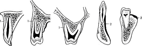 Рис. 15. Вертикальные распилы через альвеолярной отросток (а, б, в) верхней и (г, д) нижней челюстей. Тонкая (1) и более толстая (2) наружная стенка лунок на уровне резца (а, г), первого большого коренного зуба (б) и на уровне третьего большого коренного зуба (д). Этим объясняется низкая эффективность инфильтрационной анестезии на нижней челюсти. Практически ее используют только при удалении нижних резцов, имеющих патологическую подвижность. Слизистая оболочка альвеолярного отростка не имеет выраженного подслизистого слоя и плотно спаяна с надкостницей (рис. 16).