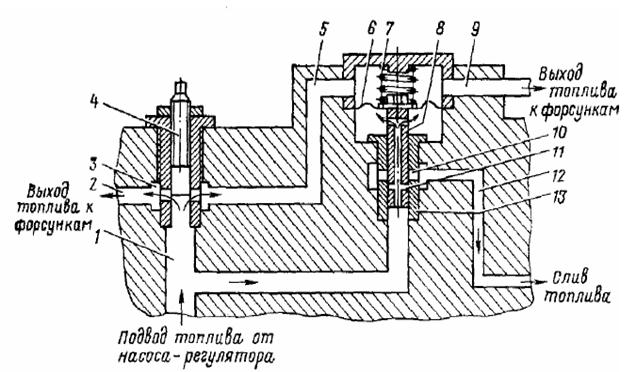Рис. 7.26. Схема ограничителя максимального расхода топлива: 1, 2, 5, 9, 12 — топливные каналы; 3 — дозирующее отверстие; 4 — регулировочный винт; 6 — мембрана; 7 — пружина; 8 — золотник; 10, 11 — отверстия слива топлива; 13 — втулка