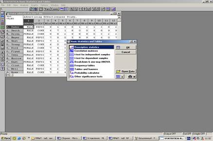 R При первом запуске STATISTICA (по умолчанию) автоматически открывается стандартный файл с данными adstudy.sta, который входит в набор примеров, поставляемых с системой (эти файлы находятся в каталоге stat\examples). При следующих запусках автоматически открывается последний файл, с которым вы работали в системе. R В рабочей области может находиться только один файл с исходными данными и неограниченное число файлов с промежуточными результатами и графиками. Исходные данные в системе STATISTICA организованы в виде электронной таблицы. Таблицы с исходными данными в STATISTICA носят особое название SPREADSHEETS и имеют расширение *.sta. Электронная таблица системы SPREADSHEETS состоит из строк и столбцов. В отличие от обычных электронных таблиц, где строки и столбцы равноправны, в STATISTICA они имеют разные смысловые значения. Столбцы электронной таблицы с исходными данными называются Variables (Переменные), а строки Cases (Наблюдения). В качестве переменных обычно выступают исследуемые признаки (величины), а наблюдения – это значения, которые принимают переменные в отдельных измерениях. Система может работать как с численными, так и с текстовыми данными. Аналогично MS Excel они поддерживают различные типы операций с данными, такие как операции с использованием буфера обмена Windows; операции с выделенными блоками значений, в том числе и с использованием метода drag-and-drop, автозаполнение блоков и т.д. Рабочее окно имеет следующую структуру: · верхний заголовок STATISTICA: Basic Statistics and Tables – запущен модуль Basic Statistics and Tables (Основные статистики и таблицы) (см. рис. 1.3). Если бы был запущен другой модуль, то его название указывалось бы в заголовке; · строка меню; · панель инструментов (под строкой меню и справа), соответствующая активному окну в рабочей области. На рис. 1.3, например, панель инструментов соответствует активному (и единственному) в данный момент окну с файлом исходных данных; · рабочая область, занимающая большую часть окна, в которой выводятся все документы системы. На рис. 1.3, в частности, кроме меню модуля Basic Statistics and Tables, открыто окно с заголовком: Data: adstudy.sta 25v*50c – файл исходных данных(Data) с именем adstudy.sta, имеющий 25 столбцов (25v (Variables) – 25 переменных) и 50 строк (50с (Cases) – 50 наблюдений).
