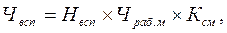 где Тпл.п – потери времени, планируемые предприятием и связанные с очередными отпусками, дополнительными отпусками по законодательству, потери времени на профилактические, ремонтные работы оборудования, потери времени по болезням рабочих и по семейным обстоятельствам. Численность вспомогательных рабочих (Чвсп) планируется по нормам обслуживания, по объёму выполняемых работ, нормам выработки. Там, где не устанавливаются нормы и объёмы, численность может быть определена в зависимости от числа рабочих мест основных рабочих (Чраб.м) и сменности работы предприятия (Ксм) по формуле (7.7):