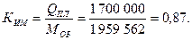 3. Рассчитаем возможный выпуск деталей: МОБ =П × FД × п = 5 × 3 880,32 × 101 = 1 959 562 (дет.). 4. Определим коэффициент использования мощности: