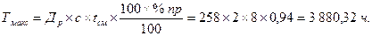Пример 4 Определите производственную мощность цеха и коэффициент использования мощности. Исходные данные: Количество однотипных станков в цехе – 100, с 1 мая выбыло 6, с 1 ноября установлено ещё 30 станков, число рабочих дней в году – 258, режим работы – двухсменный, продолжительность смены – 8 ч, регламентированный процент простоев на ремонт оборудования – 6, производительность одного станка 5 деталей в час, план выпуска за год – 1700 000 деталей. Решение: 1. Найдём действительный фонд времени работы оборудования: