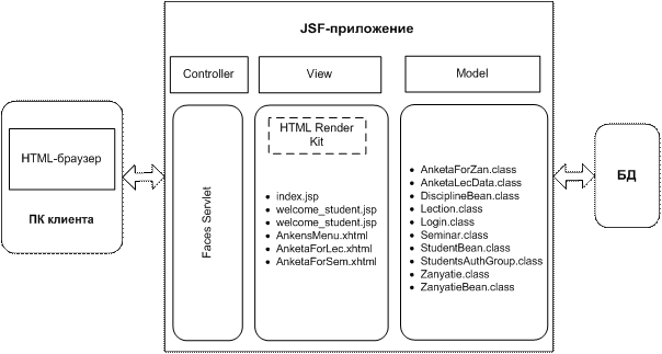 Систему анкетирования слушателей в режиме удаленного доступа, представляющую собой веб-приложение, будем разрабатывать при помощи фреймворка JSF, что позволит реализовать нам в разрабатываемой системе шаблон архитектуры MVC (Model-View-Controller) и обеспечить четкое разделение бизнес-логики и логики представления.