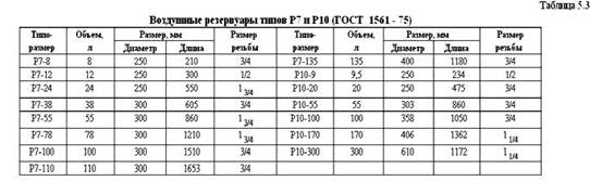 9.3. Запасные резервуары Запасные резервуары (ЗР) предназначены для хранения запаса сжатого воздуха, необходимого для торможения. ЗР устанавливаются на каждой единице подвижного состава, имеющей воздухораспределитель. ЗР выпускаются двух типов: Р7 и Р10, рассчитанные соответственно на рабочее давление 7 кгс/см2 и 10 кгс/см2. Параметры запасных резервуаров приведены в таблице 5.3.