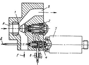 Клапан противообледенения (рис. 8.9) устанавливается на среднем корпусе компрессора с правой стороны двигателя и предназначен для перепуска горячего воздуха из-за компрессора в противообледенительную систему двигателя. Клапан противообледенения (рис. 8.10) состоит из корпуса, поршневого и золотникового механизмов и электромагнитного клапана. Горячий воздух к клапану подводится по каналу «Л», а отводится по каналам «Б» и «Г». Топливо к клапану подводится от плунжерного насоса ПН-40Р под рабочим давлением, создаваемым насосом, и поступает в клапан по каналу В.