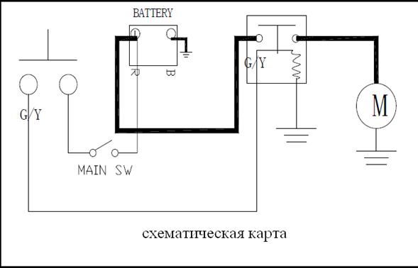 Снимите соединение стартера реле Осмотрите черный провод зажима соединения ведущего провода и открытие, заземленное на массу кузова. При нажатии кнопки стартера желтый/зеленый провод соединения и открытие, заземленное на массу кузова, будут лучше. Если нет открытия, то необходимо проверить ведущий провод и открытость кнопки стартера.